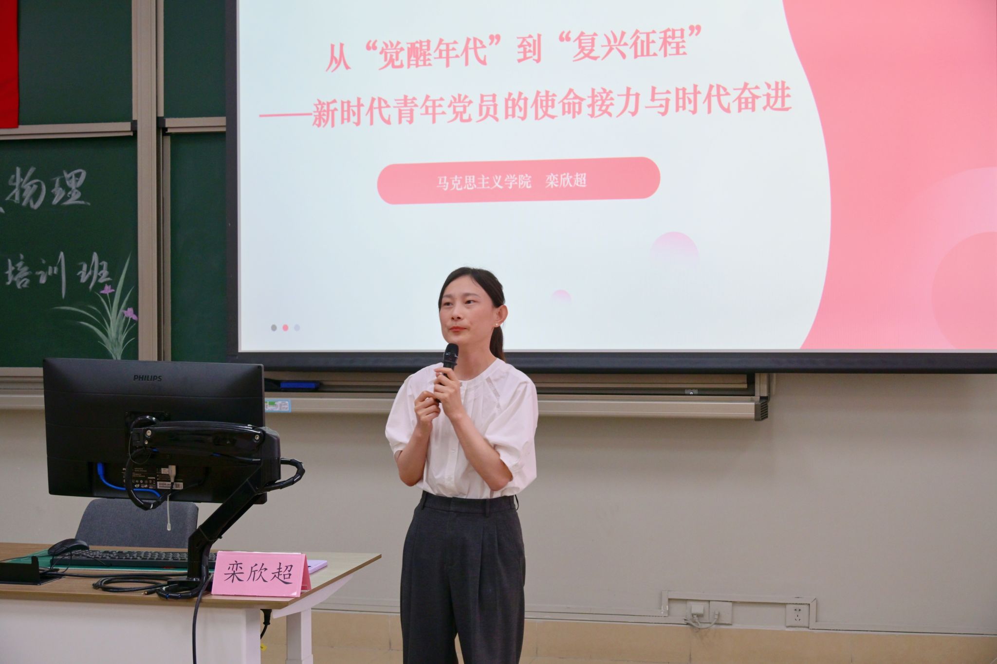 栾欣超老师以《从“觉醒年代”到“复兴征程”——新时代青年党员的使命接力与时代奋进》为题,从革命先辈“南陈北李,相约建党”的历史故事切入,带领学员感悟马克思主义的真理力量,鼓励大家把个人理想融入国家发展大局,跑好历史与时代交付的“接力棒”。